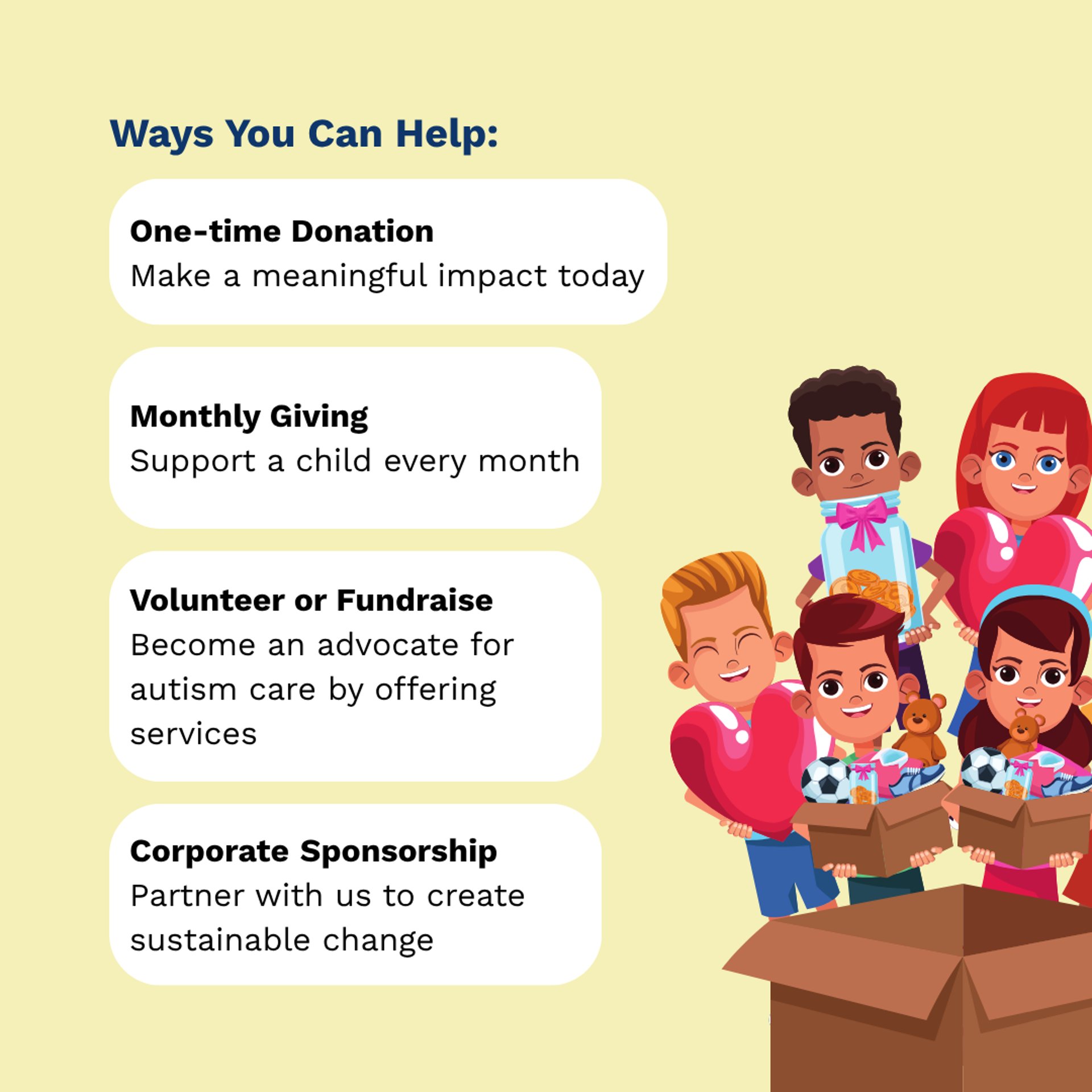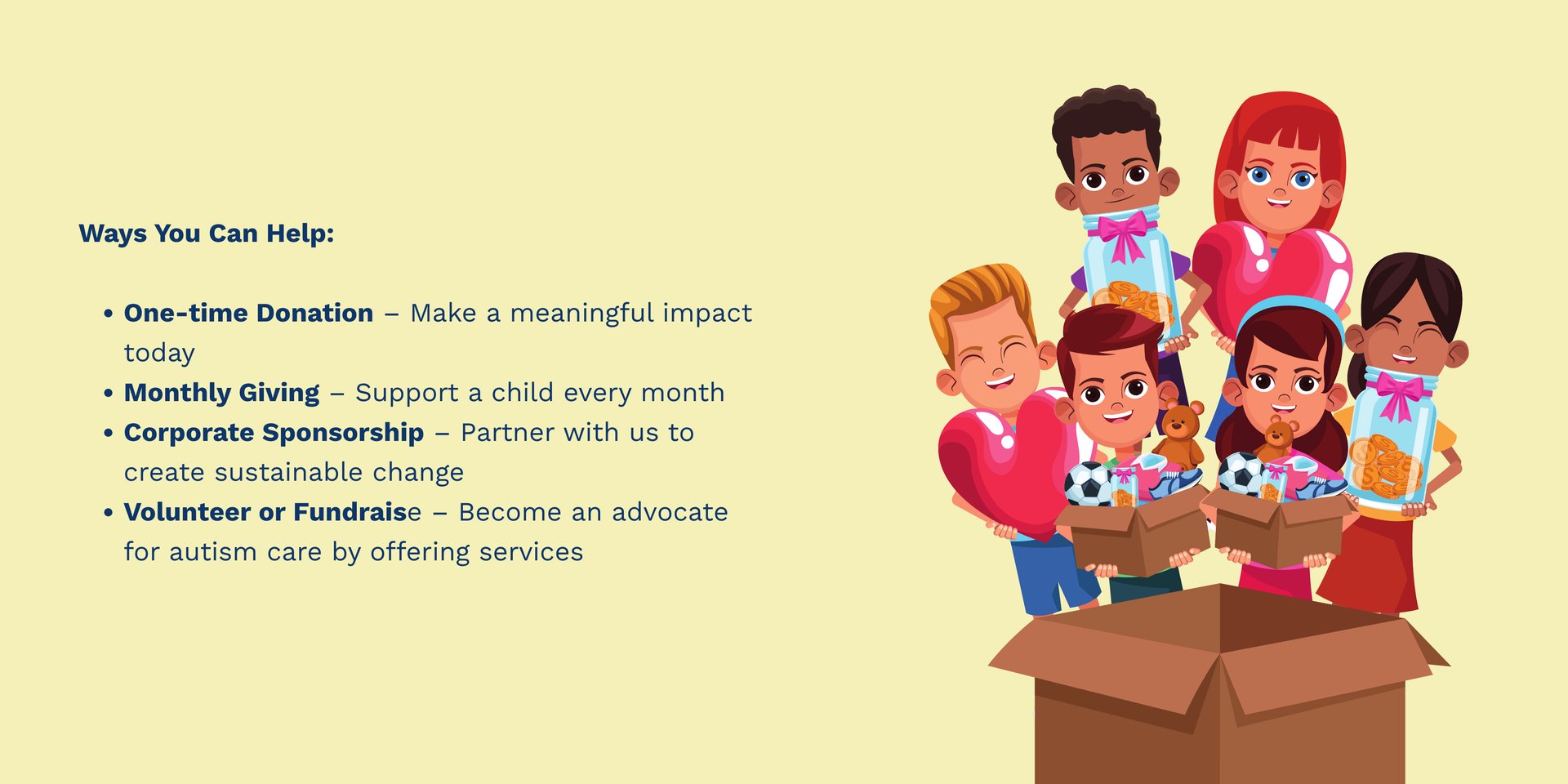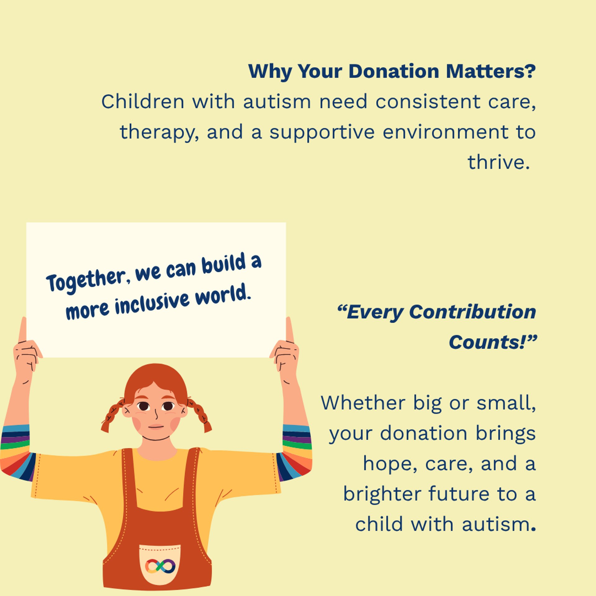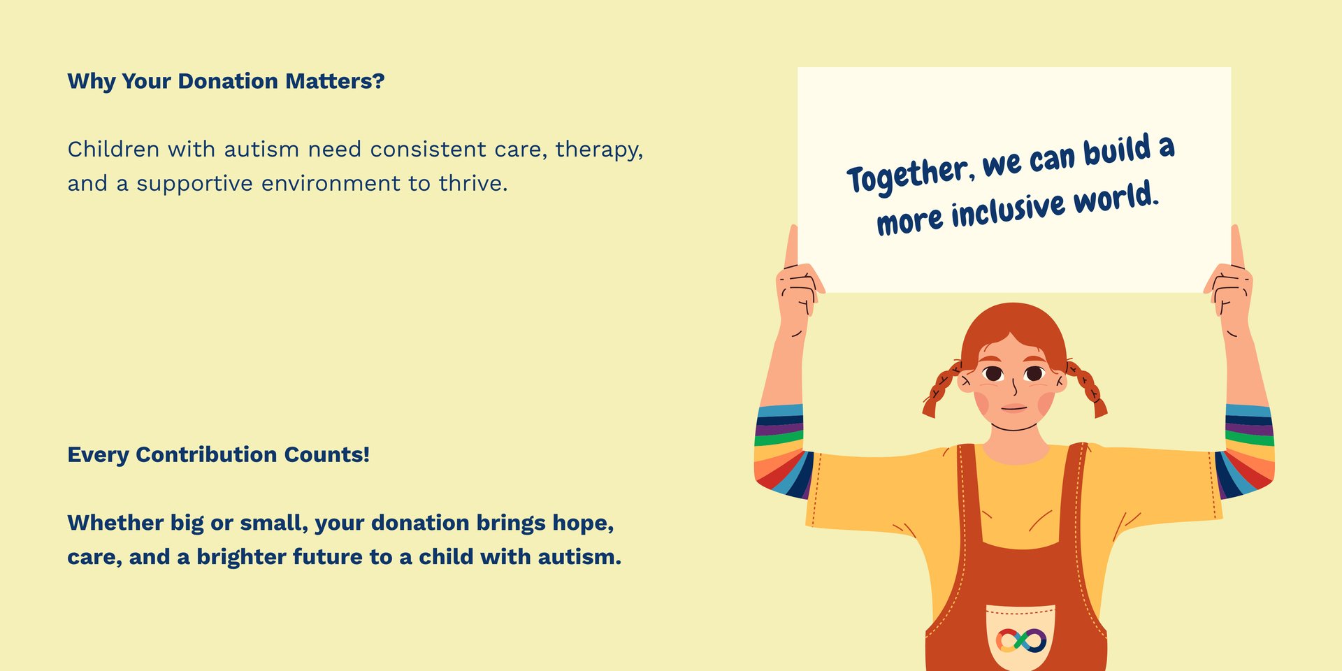 Children with autism need consistent care, therapy, and a supportive environment to thrive. With your generous support, we can: